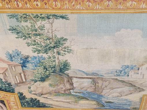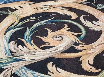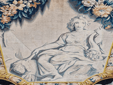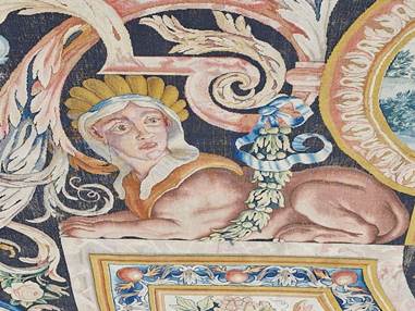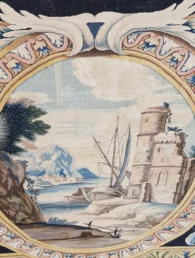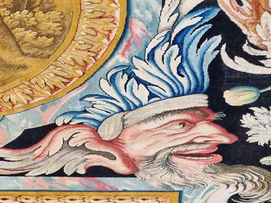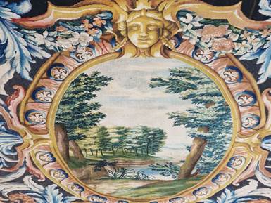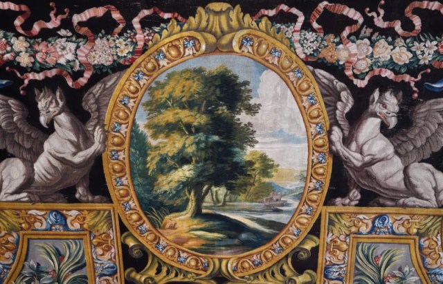 Für den auf dem Höhepunkt seiner Schaffenskraft und seines Ruhms stehenden Le Brun war der Auftrag ebenfalls eine Herausforderung: Es ging ja darum 92 Teppiche zu entwerfen, die einerseits miteinander harmonieren mussten, andererseits aber auch immer Neues, Überraschendes, Anziehendes anbieten mussten. Natürlich konnte sich der premier peintre du roi Le Brun da nicht mit einer Ansammlung von Herrschaftssymbolen begnügen. Der große Auftrag gab ihm Gelegenheit, sein Können und den Reichtum seiner Ideen zu präsentieren und damit Werbung für das „fabriqué en France“ zu betreiben. Die Teppiche zeichnen sich also durch eine Fülle von Formen, Farben und Motiven aus. So gibt es auch schöne Medaillons mit Landschaftsdarstellungen…