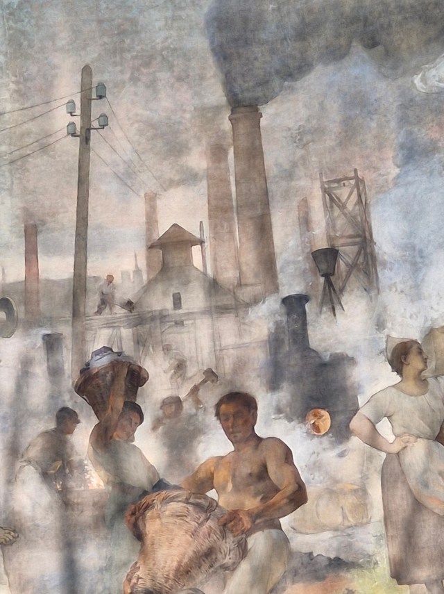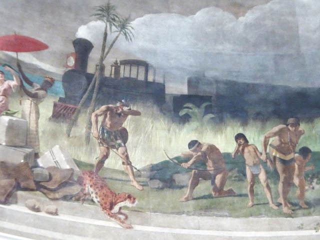 Auf vier riesigen Bildtafeln, getrennt durch Allegorien der Regionen Europa, Asien, Afrika, Amerika und des Nordens im Trompe-l‘oeil-Stil, mischen sich Phantasie und Realität: exotische Szenerien mit Bildern aus Industrie und Technik (Fabrikschornsteine, Strommast, Lokomotive).