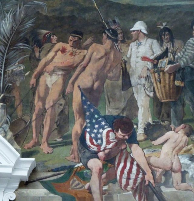 Unübersehbar ist die Gegenüberstellung der nackten „Wilden , der indigen Bevölkerung Amerikas und Afrikas, mit den korrekt gekleideten Weißen: Demonstrativer Anspruch der Überlegenheit des „weißen Mannes“. „Die rassistische Ikonographie [ist] allgegenwärtig und deckt die gesamte Bandbreite grotesker Kolonialstereotype ab. In der Amerika-Abteilung entspannt sich eine weiße Frau in einem blassrosa Kleid auf einem Baumwollballen, geschützt vor der Sonne unter einem Sonnenschirm, den ihre schwarze Zofe hält. Vor ihr kniet ein indigener Jugendlicher nieder und bietet ihr zur Unterhaltung einen Papagei an, während hinter ihr zwei eingeschüchterte Sklaven, die unbeachtet bleiben, einen Baumstamm tragen. Ein Stückchen entfernt handelt ihr Ehemann mit einer Gruppe Stammesangehöriger und bietet ihnen ein Gewehr und einen Korb mit westlicher Kleidung an.“[5]