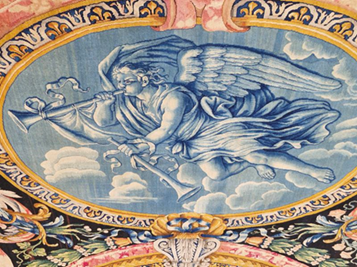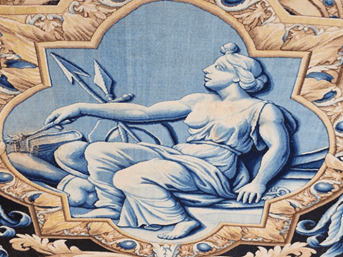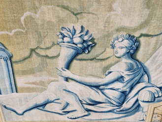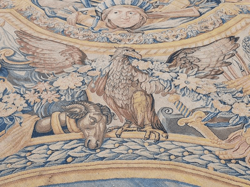 Es gibt auch einen Teppich mit allegorischen Darstellungen des Friedens: Eine weibliche Figur zerbricht die Waffen, eine andere repräsentiert den mit dem Frieden einhergehenden Wohlstand.