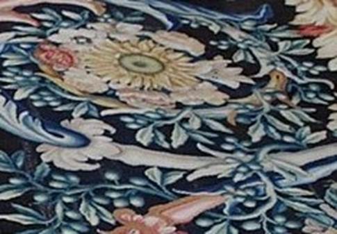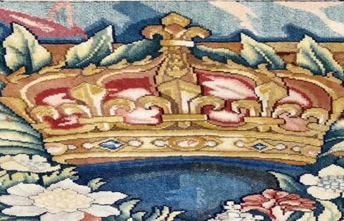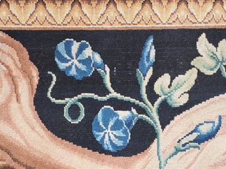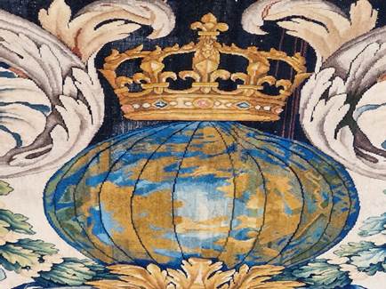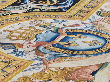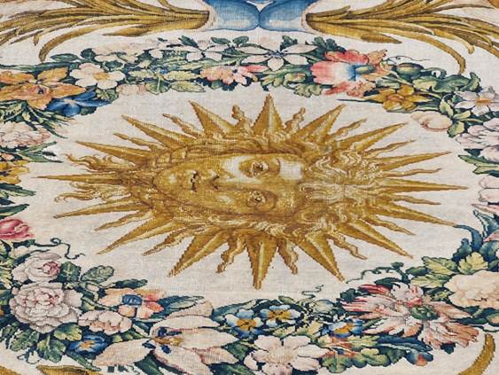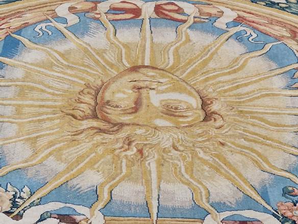 Dem entsprach die Ikonografie der Teppiche. Sie sollten das Ansehen und die Macht des Königreichs und seines Herrschers demonstrieren. Dafür dienten Herrschaftssymbole, wie sie hier auf dem ersten von ca 30 erstmalig im Grand Palais ausgerollten Teppichen zu sehen sind: Krone, die königliche Lilie und -natürlich- die Sonne.