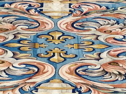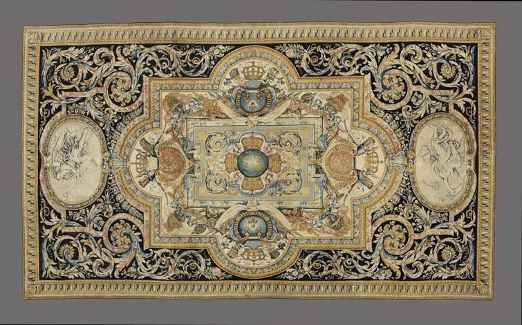 1668 folgte dann der große Auftrag für den Entwurf der 92 Teppiche in der Grande Galerie. Hier der 5. Teppich der Serie, der heute zu den Ausstellungsstücken des Louvre gehört[7]: