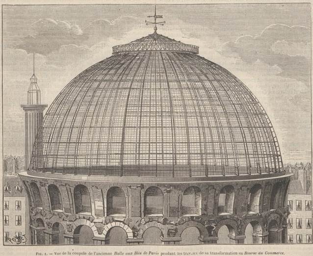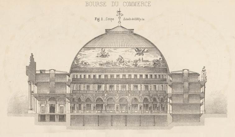 Schnitt durch die Bourse du Commerce von Blondel aus: Bourse de commerce – Le Génie civil: revue générale des industries françaises et étrangères, 27.10.1888. gallica, bnf.fr.