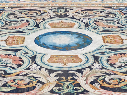 Aber Blumen und Früchte sind nicht nur dekorativ: Sie kommen ja auch aus dem Füllhorn der Abondance: Wer über den Teppich der Grande Galerie schreitet, soll sehen, dass er sich in einem Land des Wohlstands und des Glücks befindet.