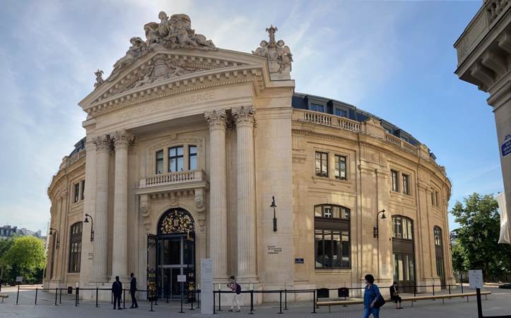 Um den inneren Kern herum schuf er einen großen Komplex mit einem zusätzlichen Zwischengeschoss (Mezzanin) und ein weiteres Stockwerk. Schließlich errichtete er einen monumentalen Portikus, dekoriert mit einem riesigen allegorischen Giebel – geschaffen von Croissy, der die Stadt Paris inmitten von Handel und Industrie repräsentierte. Die ehemalige Halle au Blé mutierte in einen Tempel der wirtschaftlichen Macht.