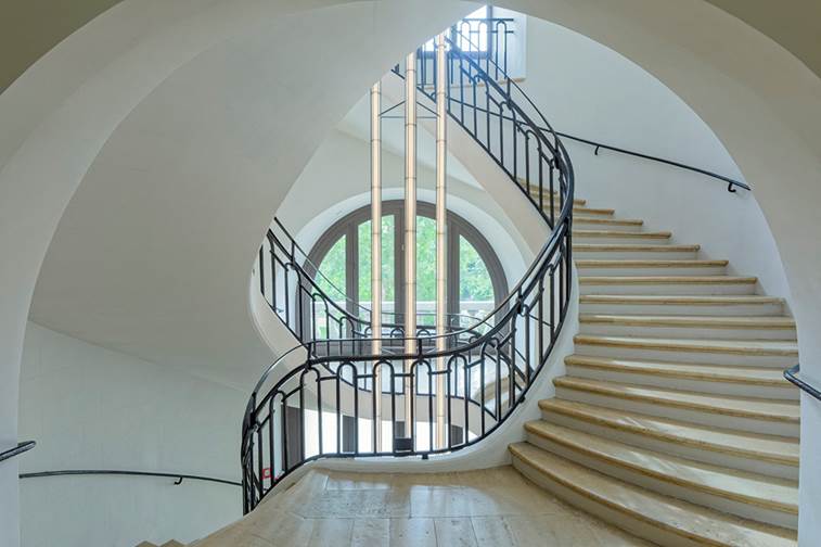 Eine Treppe schraubt sich an der Außenseite des Zylinders nach oben bis zur Spitze, wo ein „Promenoir“ in neun Metern Höhe den zentralen Kreisplatz umläuft und eine spektakuläre Aussicht auf die monumentalen Malereien an der Unterseite der Kuppel bietet.