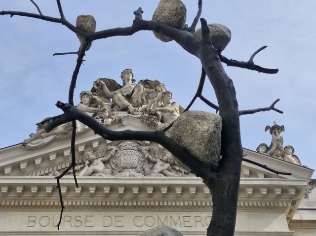 Der allegorische Giebel. Davor der obere Teil von Idee de pietra- 1532 kg di luce von Giuseppe Penone aus dem Jahr 2010 – der Bronzeabguss eines Baums mit vom Wasser geschliffenen Steinen, der dauerhaft auf dem Vorplatz der Bours installiert ist. Foto: Wolf Jöckel