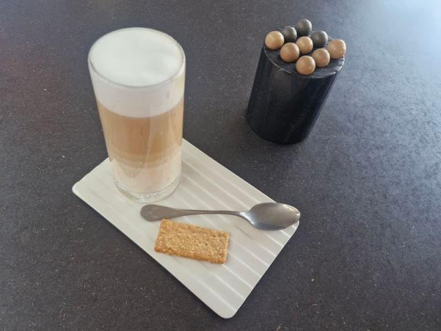 Die kleinen Schoko-Kügelchen, die zusammen mit dem Kaffee serviert werden, haben – dem genius loci entsprechend- einen Kern aus verschiedenen Getreiden.
