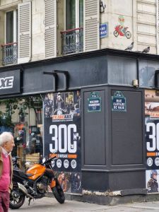 …. ein Motorrad an dem Motorradladen Boulevard Beaumarchais oder ein trotziges „Ich war hier“ hinter dem während der Renovierungsarbeiten angebrachten Netz….