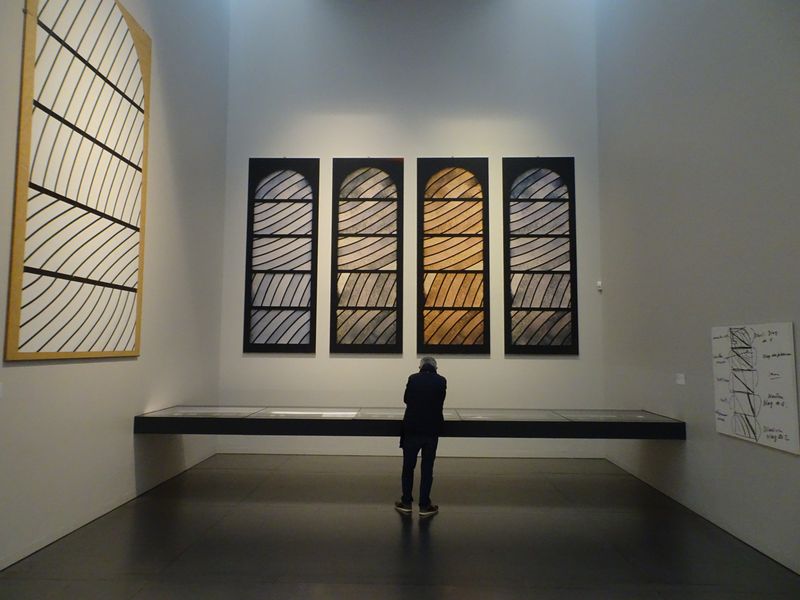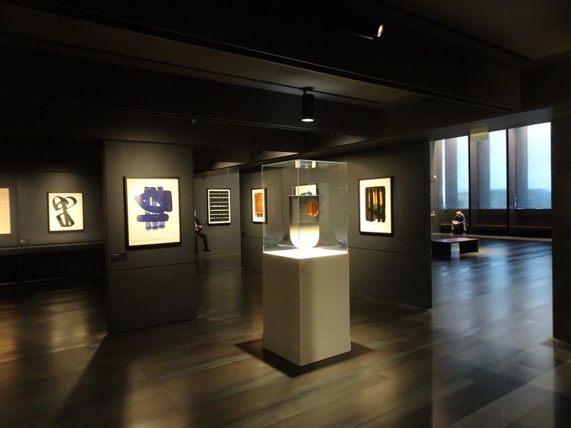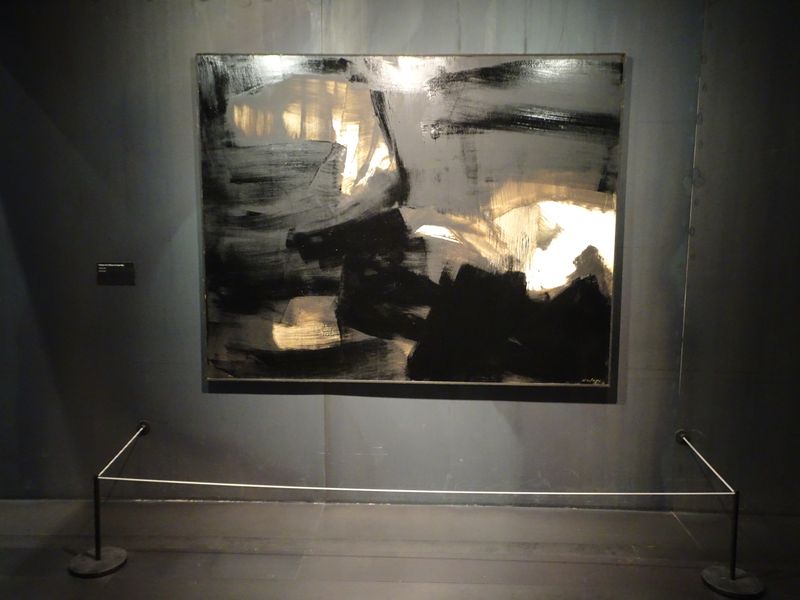 Blick in zwei Säle des Museums. Die großformatigen Bilder hängen hier, wie es Soulages seit den 1970-er Jahren bevorzugt, frei im Raum.[5]