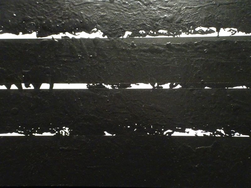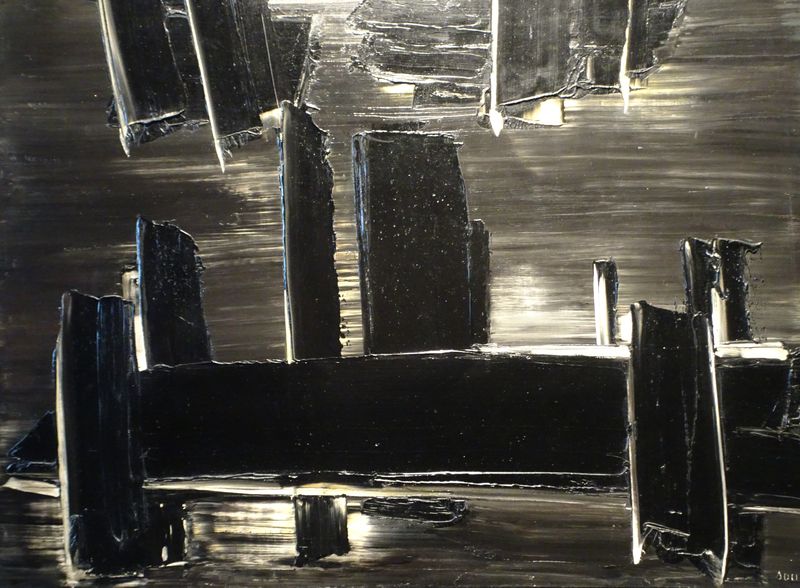 Nachfolgend werden einige Werke von Soulages (überwiegend) aus dem Museum von Rodez vorgestellt. Die Auswahl ist völlig unrepräsentativ und willkürlich. Vor allem sind es Arbeiten (zum Teil auch nur Ausschnitte), die uns besonders beeindruckt haben. Dann sollten aber auch wenigstens ansatzweise verschiedene Schaffensperioden, Techniken und Materialien berücksichtigt werden. Und es sollte deutlich werden, dass in Soulages‘ Kunst die Farbe schwarz zwar eine zentrale Rolle spielt und gewissermaßen sein Markenzeichen ist, dass er aber keinen Falls als „Schwarzmaler“ abgetan werden sollte. In seinen eigenen Worten: