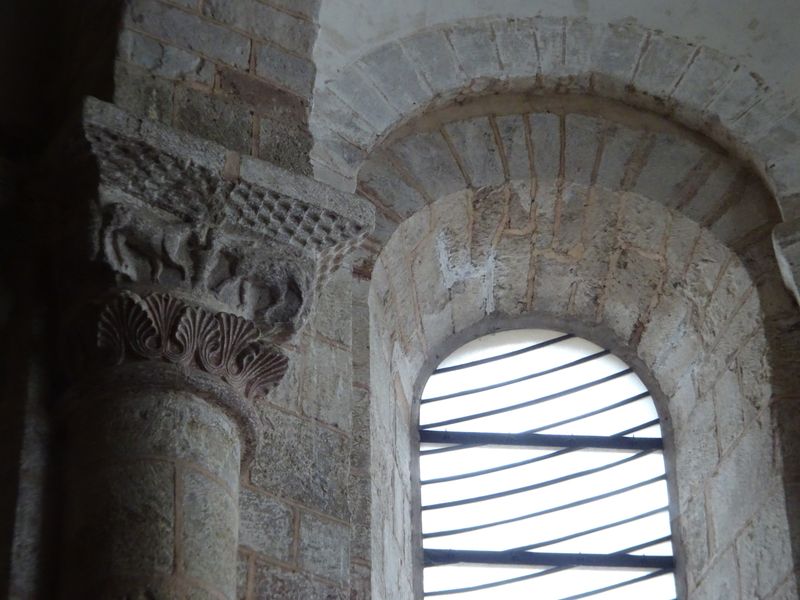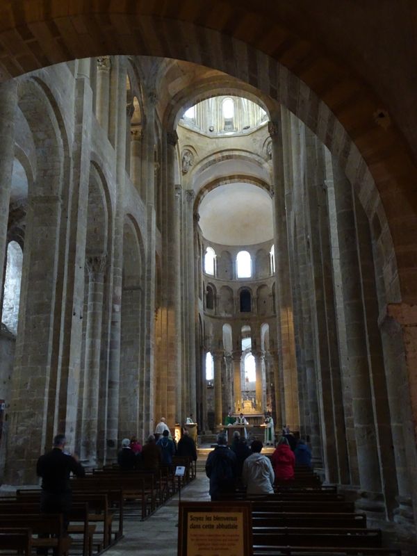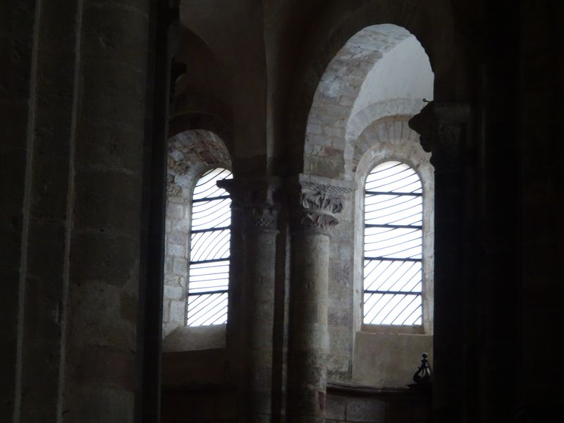 „Vom Eingang an ist man beeindruckt von den schmalen und hohen Fenstern mit den tiefen Laibungen: die Mauern sind sehr dick. Und zu gleicher Zeit ist man in Gegenwart eines hohen Kirchenschiffes, das dadurch umso höher erscheint, als es schmal ist. … Die Kirche in Conques … hat ein Mittelschiff von 22,10 m Höhe bei einer Breite von 6,80m, was sie noch höher aufgeschossen erscheinen lässt. So erscheint in dieser Massivität Anmut.“[23]