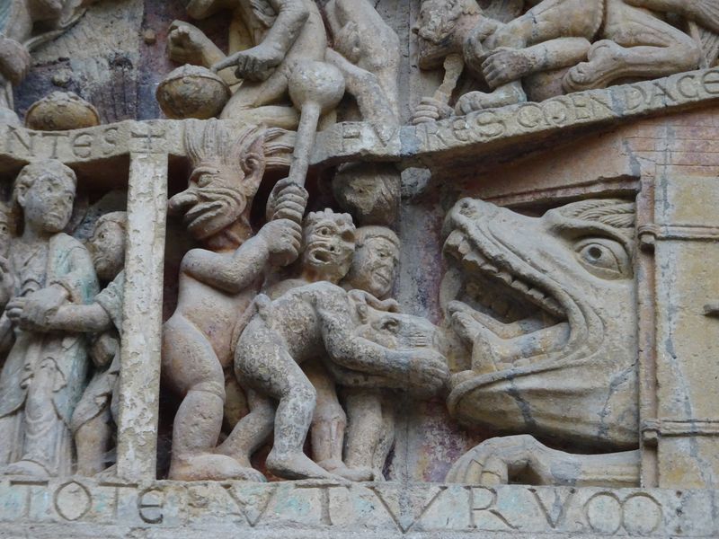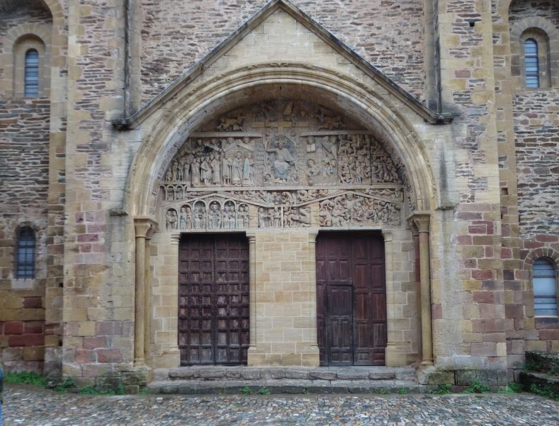 [30] Text zum Tympanon nach: https://de.wikipedia.org/wiki/Ste-Foy_(Conques) Dort auch weitere detaillierte Informationen. Der erstaunlich gute Erhaltungszustand des Tympanons erklärt sich durch einen inzwischen zerstörten Vorbau, der die Plastiken vor den Einflüssen der Witterung schützte.