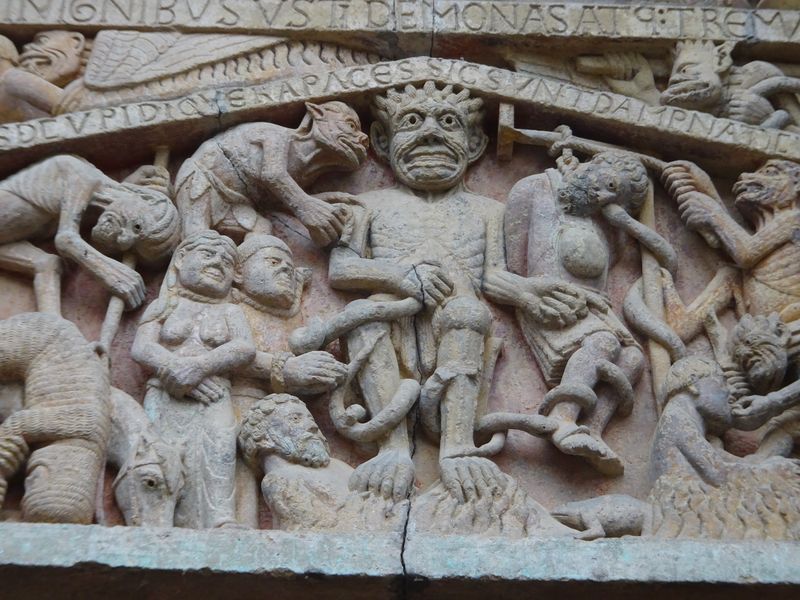 Bevor man die Kirche betritt, um den Innenraum mit den Fenstern Soulages‘ zu bewundern, lohnt es sich, das große Tympanon des Eingangsportals zu betrachten, das mit seinen 117 Figuren zu den Höhepunkten mittelalterlicher Kunst gehört. Sein Generalthema ist das Jüngste Gericht.[30] Besonders eindrucksvoll ist hier –wie auch in anderen entsprechenden mittelalterlichen Darstellungen- die drastische Schilderung des Schicksals der Verdammten im rechten unteren Teil des Tympanons, wo es –im Gegensatz zu der wohlgeordneten linken Seite (zur Rechten Gottes)- im wahrsten Sinne des Wortes drunter und drüber geht.