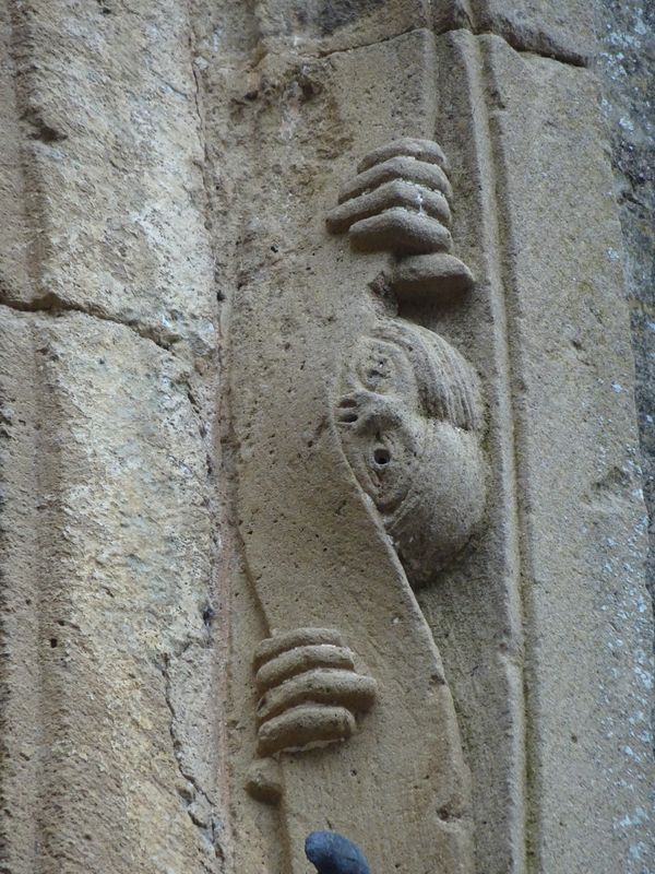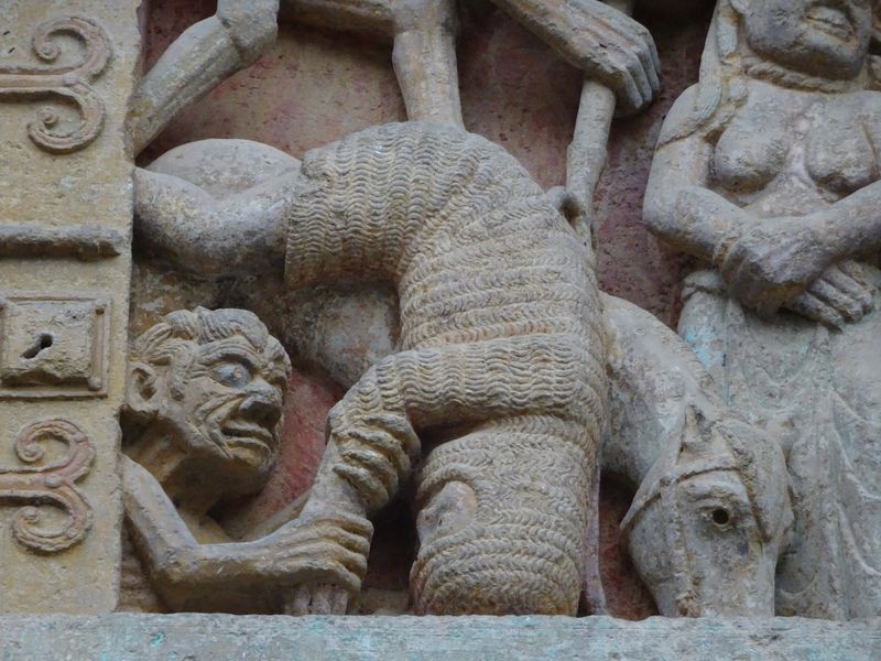 Um das Tympanon herum läuft ein Band, hinter dem menschliche Köpfe mit weit aufgerissenen Augen sichtbar sind. Sie betrachten das grausige Geschehen und werden, wie die Mönche des Klosters und die mittelalterlichen Pilger, hoffen und beten, im späteren Leben einmal zu den Seligen zu gehören und nicht dem Wüten des Satans anheim zu fallen.