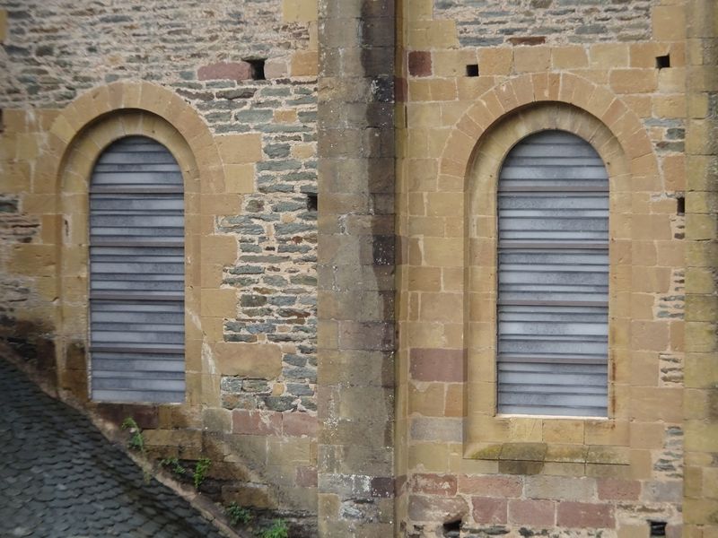[26] Pierre Soulages, Die Fenster von Conques, Anmerkungen zur Arbeit. In: Soulages. Lebendiges Licht. Malerei und die Fenster von Conques. S. 22 Nachfolgendes Bild aus: https://www.tourisme-conques.fr/de/de-conques/die-kirchenfenster-von-soulages