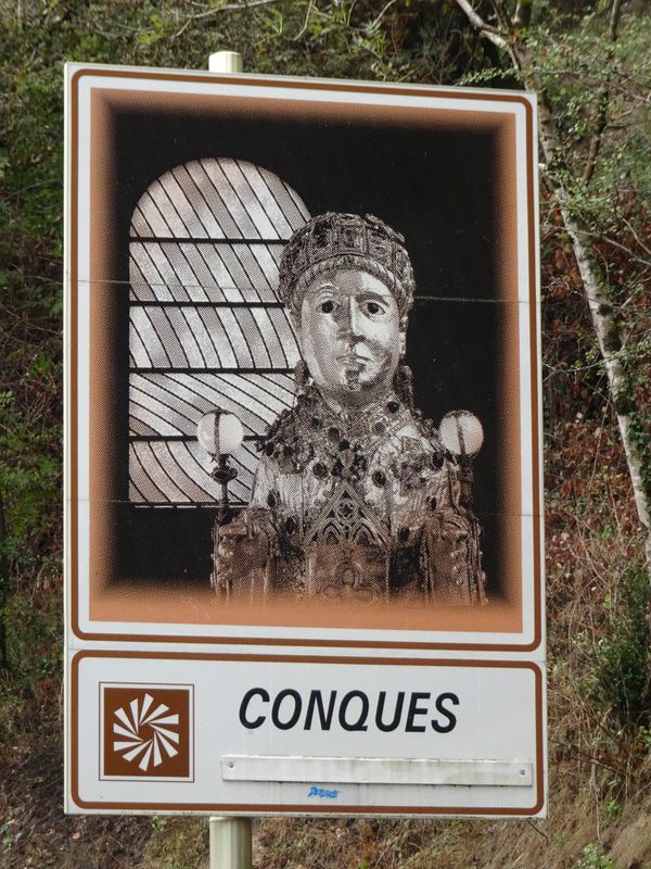 Der Besuch der Klosterkirche von Conques lohnt aber nicht nur wegen der Glasfenster von Soulages. Die Bedeutung von Conques, heute Teil des Weltkulturerbes „Jacobsweg in Frankreich“, beruht vor allem auf drei künstlerischen Höhepunkten, von denen zwei auf diesem touristischen Hinweisschild veranschaulicht sind: