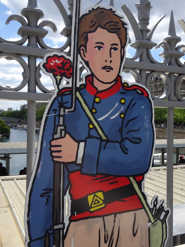 Insgesamt sind an dem Zaun zur Metro-Station und zum Arsenal-Hafen 50 „Pappkameraden“ mit den Portraits von Kommunarden befestigt: Es sind Männer und Frauen unterschiedlichen Alters, sozialer Zugehörigkeit, nationaler bzw. geographischer Herkunft, unterschiedlicher politischer Tendenzen und mit ganz verschiedenem beruflichem Hintergrund. Teils findet man hier prominente Gestalten der Commune wie Louise Michel, Jules Vallès oder Gustave Courbet, teils kaum bekannte Männer und Frauen, die sich auf unterschiedliche Weise in der Commune engagiert haben. Sie hier aufzunehmen war den Machern der Ausstellung besonders wichtig: „Nous la Commune“ soll gerade die breite Anhängerschaft der Commune in der Pariser Bevölkerung aufzeigen. Eine Beschränkung auf die „Prominenz“ wäre diesem Anspruch kaum gerecht geworden. Vielen der Abgebildeten wurde deshalb, weil entsprechende zeitgenössische Darstellungen fehlen, hier vielleicht zum ersten Mal visuelle Gestalt gegeben. Unterschiedlich ist auch das Schicksal der in die Ausstellung aufgenommenen Personen: Manche sind im Kampf getötet worden, andere wurden in oder nach der „Blutwoche“, der semaine sanglante, erschossen oder deportiert, wieder andere gingen ins Exil. Einige wenige konnten aber auch ihr voriges Leben fortsetzen. Den Figuren der Ausstellung sind jeweils entsprechende Informationen beigegeben: zum Beispiel ein Rednerpult für gewählte Mitglieder der Commune, eine phrygische Mütze für Anhänger des Jacobinismus, ein Schiff für die Deportierten, ein Totenkopf für die im Kampf Gefallenen…. Dazu gibt es jeweils einen kleinen biographischen Text. Insgesamt eine anschauliche und anregende Präsentation am passenden Ort: Nicht nur wegen der revolutionären Tradition des Bastille-Platzes, sondern auch wegen seiner Belebt- und neuerdings auch gesteigerten Beliebtheit. So müssen die Menschen nicht Barrieren überwinden, um zur Ausstellung zu kommen, sondern diese kommt zu ihnen.