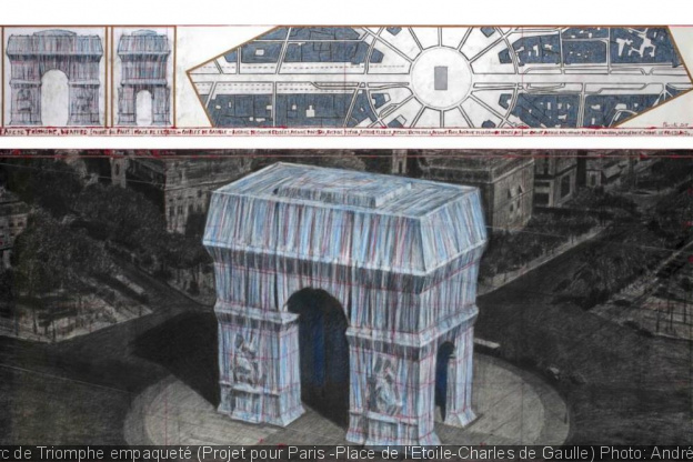 Das nachfolgende Foto aus: https://www.lesechos.fr/industrie-services/services-conseils/comment-christo-a-imagine-un-financement-original-pour-empaqueter-larc-de-triomphe-1340179