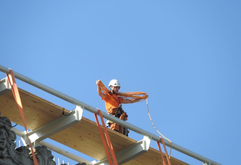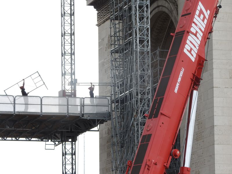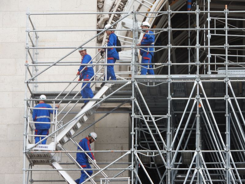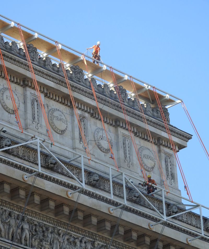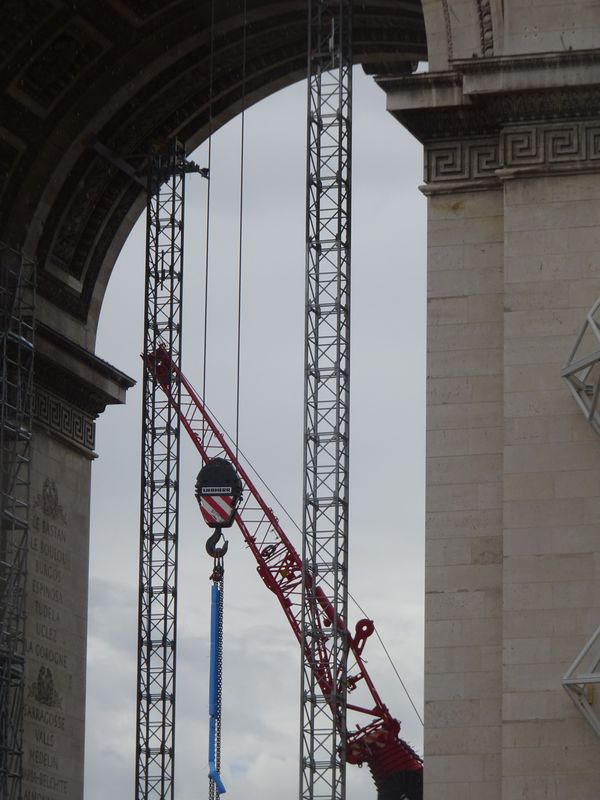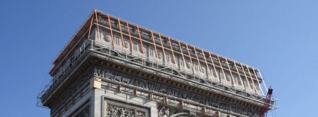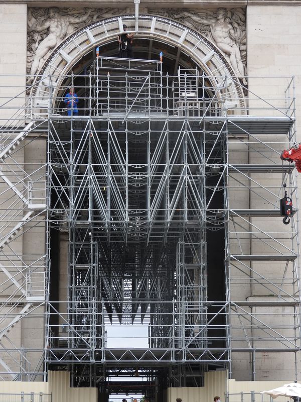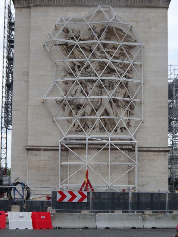 Geplant und installiert wurden die Stahlbau-Gerüste und Schutzvorrichtungen übrigens von einem deutschen Ingenieurbüro aus Stuttgart. Verantwortlich vor Ort ist eine junge Bauingenieurin, Anne Burkhartz. In dem Artikel „L’art pour l’Arc“ von Michaela Wiegel in der FAZ vom 25.8. kommt sie zu Wort: „Manchmal gerate ich ganz schön ins Schwitzen, denn wir dürfen auf keinen Fall das Baudenkmal beschädigen.“ Jetzt sei das Stahlbaugerüst so gut wie fertig aufgebaut, „und ich bedauere beinahe, dass unsere Maßarbeit bald nicht mehr zu sehen ist.“