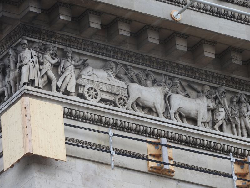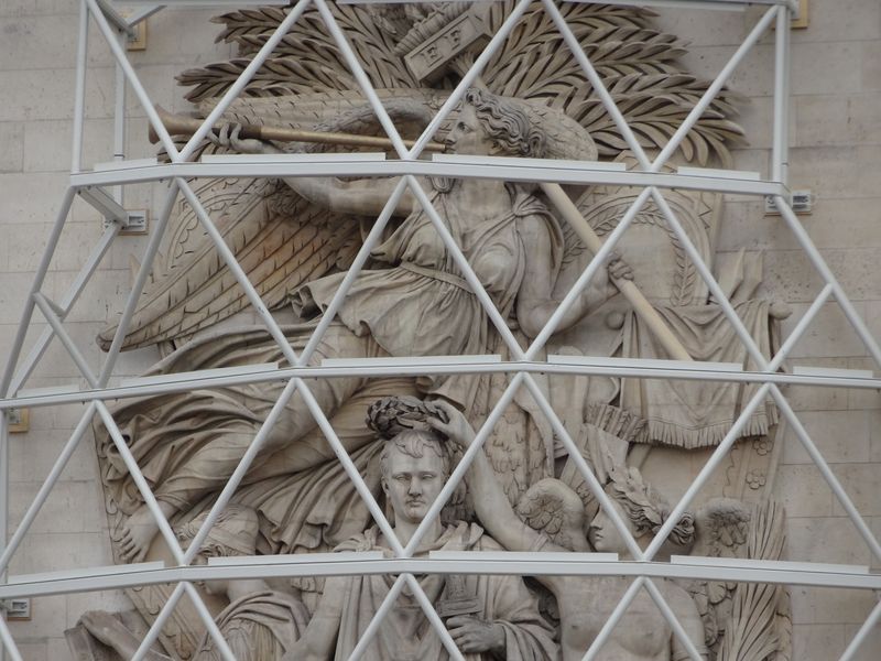 Hier das mit einem Schutz versehene Hochrelief von François Rude, Der Auszug der Freiwilligen, auch Marseillaise genannt, auf der von den Champs-Elysées aus gesehenen rechten Schauseite des Triumphbogens. (Foto vom 2.8.) Thema ist die levée en masse von 1793: Alt und jung sind auf dem Weg in den Kampf, zu dem die geflügelte Kriegsgöttin mit ihrem Schwert den Weg weist.
