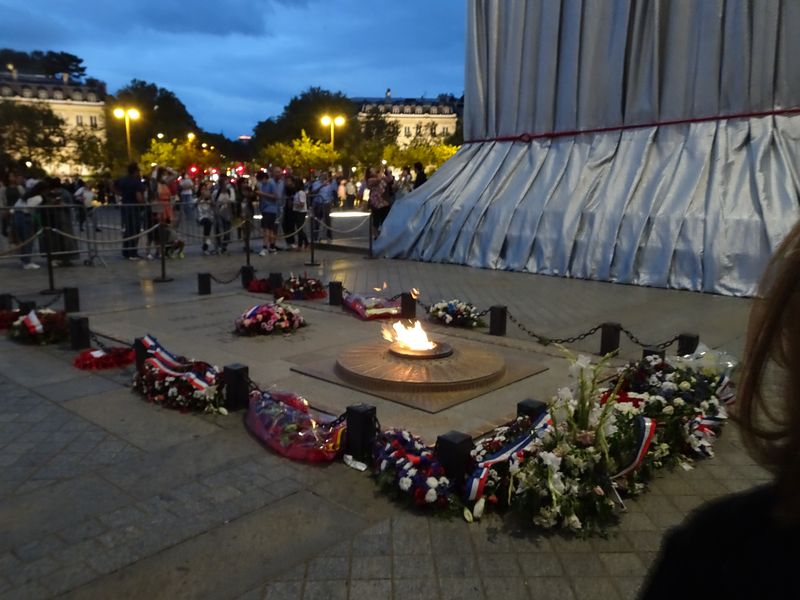 Nicht verhüllt dagegen ist das Grab des unbekannten Soldaten unter dem Bogen. So hatte es Christo ausdrücklich festgelegt: „Die Flamme der Nation vor dem Grab des Unbekannten Soldaten unter dem Arc de Triomphe wird während des Auf- und Abbaus sowie während der gesamten Zeit, in der das Werk sichtbar ist, weiter brennen.[32]   Der Blick auf die Opfer der Kriege bleibt also unverdeckt.