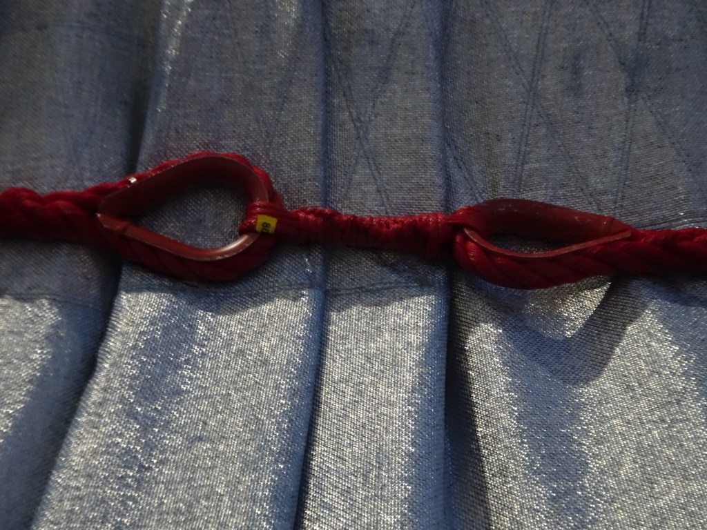 Zum Schluss werden die Stoffbahnen dann noch einmal mit -hier noch herunterhängenden- roten Tauen von 3000 Metern Länge befestigt und gesichert.