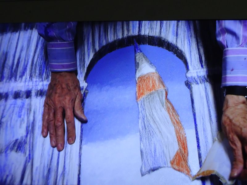 [3] Nachfolgendes Foto: Filmstill aus dem Film Christo in his studio working on a preparatory drawing for „L’Arc de Triomphe, Wrapped,“ New York, 2019. Von Trevor Tweeten. Siehe auch: https://vimeo.com/562453116