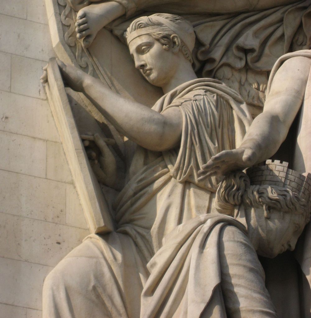 Verhüllt ist dann auch die Hand Napoleons, die symbolisch auf dem Kopf einer am Boden knieenden besiegten Stadt liegt, während Clio, die Muse der Heldendichtung und Geschichtsschreibung, auf einer Tafel die Siege für die Ewigkeit festhält.