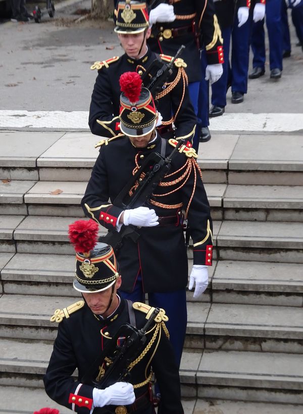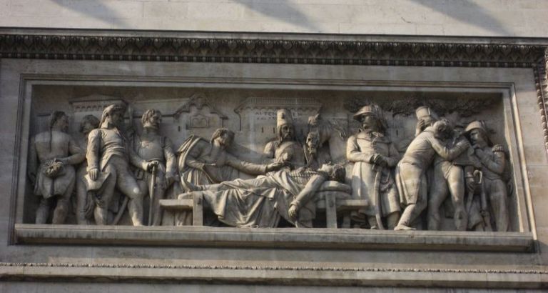 Verzeichnet sind also die Namen von Siegen und Siegern. Tote gibt es auf dem Arc de Triomphe aber auch: Es sind Feinde, die am Boden liegen, wie der ottomanische Soldat auf dem Relief über dem „Triumph Napoleons“. Napoleon reitet als siegreicher Feldherr der Schlacht von Aboukir in Ägypten gerade über ihn und die zerstörten Waffen des Gegners hinweg. Auf dem Pfeiler daneben wird auf dem Relief über der Marseillaise aber auch ein französischer Gefallener abgebildet: Es ist der General Marceau, der 1796 im Kampf gegen die Österreicher den „Heldentot“ starb. Er ist auf dem Totenbett aufgebahrt und der österreichische Erzherzog legt eine Krone auf seinen Leichnam. Selbst der Gegner erweist also dem Helden die Ehre!