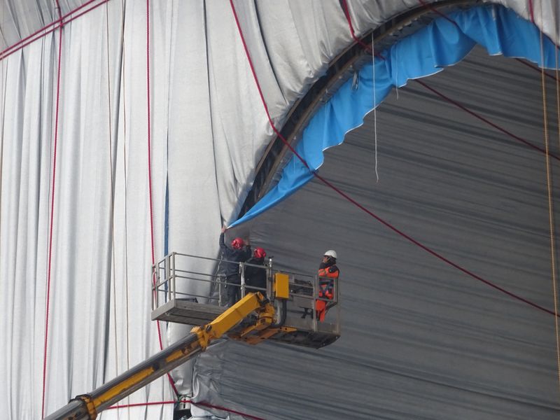 Und darüber wurden in einem letzten Akt 25.000 m2 silberblauer Stoff gebreitet- Planen aus aluminiumbedampftem Polypropylengewebe, die übrigens in Deutschland hergestellt wurden: Produziert hat das Gewebe die Firma Setex in Greven. Sie ist Nachfolgerin des Unternehmens Schilgen aus Emsdetten, das schon den Stoff für die Verhüllung des Reichstages lieferte. Setex verkauft vornehmlich schwer entflammbare Stoffe, die für Uniformen von Feuerwehrleuten und für Theatervorhänge verwendet werden. Schon „die neuen Kleider der Inseln des Iseo-Sees“ hatte Setex für die Christos hergestellt. Doch bevor das Gewebe zur Verhüllung verwendet werden kann, sind noch zwei weitere Arbeitsschritte erforderlich: Der Stoff wird zunächst noch beschichtet, was ihm seinen silbrigen Glanz verleiht und dazu beiträgt dass sich das verhüllte Gebäude nicht allzu sehr erwärmt: Ein Werk der Firma Rowo Coating aus der Kleinstadt Herbolzheim in Baden, die auch schon den Stoff für den Reichstag beschichte. [2a]