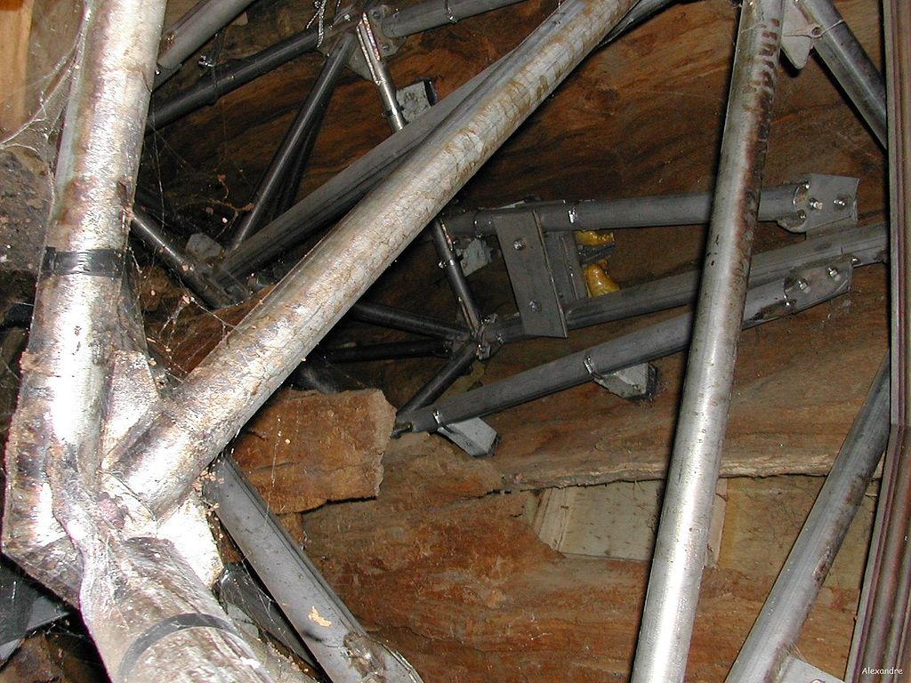 Man darf die Eremitenkammer nicht geräumig denken, kaum vorstellbar, dass hier neben einer Schreibstelle ein Bett Platz gefunden haben soll. Auch die Kapelle ist winzig, 1,75 auf 1,20 Meter, die Raumhöhe allerdings liegt bei angenehmen 2,30 Mtern, und blick man nach oben, sieht man nicht nur die rissige Innenseite des Baumes, sondern auch all die Metallverstrebungen, die im Laufe der Zeit eingebaut wurden, um dem eigenwilligen Raum Stabilität zu verleihen und den Boden der darüberliegenden Kammer abzusichern.