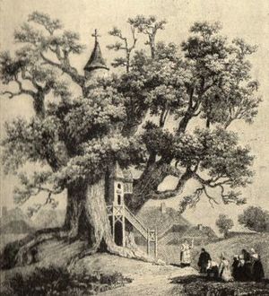 An diesem Baum kann man sehr deutlich erkennen, dass das Leben der Bäume in den äußersten Schichten steckt, auf das tote Kernholz kann getrost verzichtet werden, wichtig ist allein, dass das teilungsaktive Kambiumgewebe intakt ist und nach innen Splintholz bildet und nach außen Bast, damit Wasser und Mineralien aus dem Boden durch die Kapillaren der neu gebildeten Splintholzzellen von der Wurzel in die Krone und die in den Blättern gebildeten Zucker und andere Nährstoffe durch den Bast von der Krone in die Wurzeln gelangen können. Dass auf der Borke Quadratmeter um Quadratmeter Holzschindeln angebracht wurden, scheint der Eiche nicht allzu sehr geschadet zu haben, sie ist eine der ältesten Stiel-Eichen überhaupt; keine der sogenannten Tausendjährigen Eichen, derer Deutschland sich rühmt, hat das Alter dieses doch recht malträtierten Exemplars erreicht. Seit der Abt und der Pfarrer die Kapelle gesegnet und der Jungfrau Maria geweiht haben, finden hier Gottesdienste statt, noch heute zweimal im Jahr. Historische Fotos zeigen den Pfarrer im Talar neben dem geschlitzten Eingang, der immer schmaler wird, weil die Eiche weiter wächst, die Kirchgemeinde steht in Sonntagskleidung bis auf die Straße hinaus.