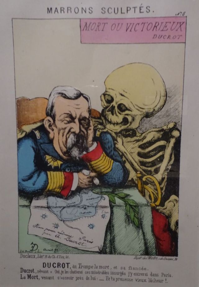 Auf dieser Karikatur werden die Worte von Ducrot aus seinem Tagesbefehl vom 28.11. „mort ou victorieux“ zitiert. Ducrot sitzt träumend über der Karte mit dem eingeschlossenen Paris und sinnt darüber nach, wie er die Commune, die dort herrscht (ces misérables insurgés), zur Raison bringen kann. Jetzt geht es für ihn nicht mehr um den Ausbruch aus dem belagerten Paris, sondern um den Angriff aus dem gemeinsamen Belagerungsring von Truppen der Republik (den sogenannten Versaillais) und der deutschen Armee auf das Paris der Commune. Der Lorbeer hängt welk herunter.
