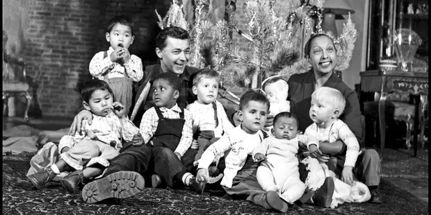 1954 begann Josephine Baker ihren Regenbogen-Traum der Adoption von Kindern mit gelber, schwarzer, weißer und roter Hautfarbe zu verwirklichen. Zunächst sollten es nur vier oder fünf Kinder sein -von den fünf Kontinenten- aber dann wurden es immer mehr. Josephine Baker war ständig auf Tournee, und fast von jeder Reise brachte sie ein neues Kind mit. Sie taufte die neue Familie rainbow tribe/tribu arc-en-ciel, Regenbogenstamm, der der ganzen Welt präsentiert werden sollte als Beweis dafür, dass Kinder unterschiedlicher Herkunft gemeinsam wie Brüder und Schwestern aufwachsen können, dass der Rassenhass also nicht naturgegeben ist, sondern eine Erfindung von Menschen.[60] Das Schloss von Milandes wurde nun in eine Touristenzentrum verwandelt. Auf den Straßen der Umgebung wurden Schilder angebracht, die dazu einluden, das „Dorf der Welt“ oder die „Hauptstadt der Brüderlichkeit“ zu besuchen. Ende der 1950-er Jahre waren es 300 000 Menschen pro Jahr, die dieser Einladung folgten.