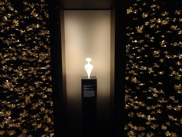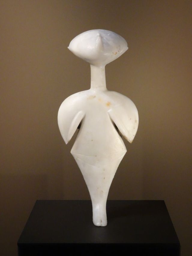 Nachfolgend eine kleine Auswahl der in der Ausstellung präsentierten Kostbarkeiten. Hier ist es eine kleine Marmor-Figur aus Kleinasien (3300-2500 vor Christus), gleichzeitig entstanden und eng verwandt mit den Idolen der Zykladen-Kunst. Wahrscheinlich handelte es sich um ein Fruchtbarkeits-Idol, das schließlich als Grabbeigabe diente. Der Blick der Figur ist nach oben gerichtet, weshalb man ihr den Namen Contemplatice d’étoiles (Stargazer) gegeben hat- und in diesem Raum gibt es ja nun genug Sterne zum Betrachten…