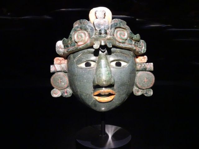 Eine besondere Kostbarkeit ist auch diese kleine, nur 12 cm hohe Maya-Maske aus dem nördlichen Zentralamerika. Entstanden ist sie zwischen 200 und 600 nach Christus. Auffällig ist dabei neben den verwendeten Edelsteinen die Mütze in Form eines Jaguars, ein Tier, das bei den Mayas für das Jenseits, den Krieg, das Opfer und hohen Rang stand. Vermutlich gehörte sie einem hohen Würdenträger, der sie bei Zeremonien trug und die dann als Begleiter für den Weg ins Jenseits und als Garantie für ein ewiges Leben diente.[22]