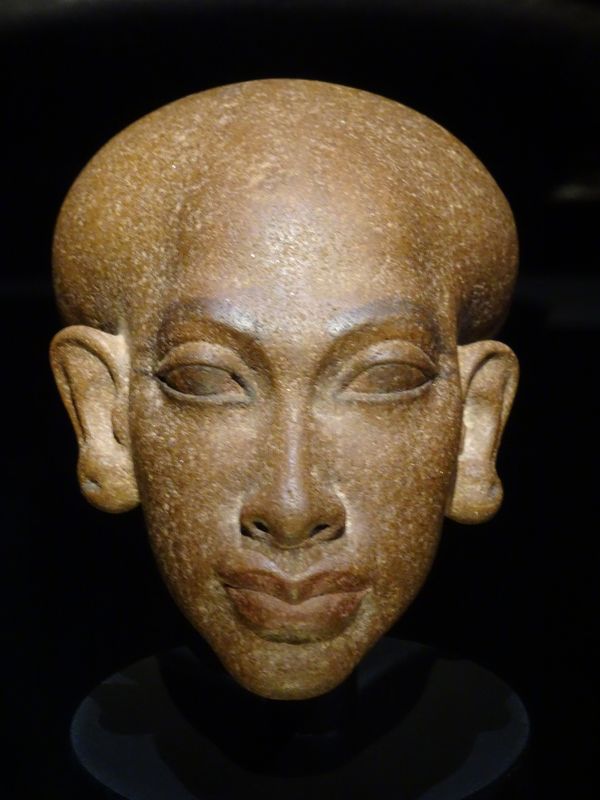 Der Kopf einer altägyptischen Prinzessin aus Amarna (18. Dynastie, 1351-1334 vor Christus). Amarna war die von Pharao Echnaton -verheiratet mit Nofretete- gegründete neue Hauptstadt, in der die Kunst eine beispiellose Blüte erlebte, die mit den traditionellen, erstarrten Formen brach. Der in der Ausstellung gezeigte Kopf ist mit seiner vermutlich spirituell bedingten expressionistischen Übersteigerung und Verzerrung typisch für die Amarna-Kunst.