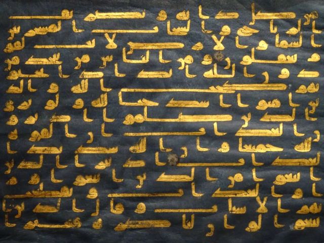 Hier eine Seite des Korans von Taschkent, auch Blauer Koran genannt (Ausschnitt): Durch die kunstvolle Kalligraphie und das dafür verwendete Gold wird die Bedeutung des Textes hervorgehoben. (Herkunft aus Südspanien, Nordafrika oder Irak, 9.-10. Jahrhundert nach Chr.