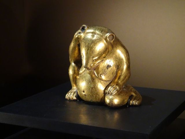 Dieser kleine entzückende Bär aus vergoldeter Bronze stammt aus China (Han-Dynastie, 206 vor bis 25 nach Chr.). Es soll sich um ein Gewicht zur Befestigung von Teppichen oder Bambusmöbeln gehandelt haben, aber natürlich hat die Wahl des Bären auch eine symbolische Bedeutung und steht für Tapferkeit, Kraft und Männlichkeit. Der Kriegsgott Chiyou wurde damals mit dem Kopf eines Bären dargestellt.