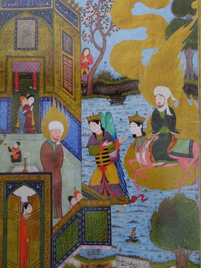 Miniatur aus einer afghanischen Handschrift, 2. Hälfte des 15. Jahrhunderts: Der Prophet Mohammed besucht das Haus Abrahams im Paradies (Ausschnitt). Während sich die europäischen Herrscher gerne mit Skulpturen und Bildern umgaben, sammelten islamische Herrscher bevorzugt kostbare Handschriften und Miniaturen, deren Meister -wie hier (Mitte unten)- durchaus auch ihre Werke signierten.