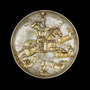 Teller aus dem Iran (Epoche der Sassaniden 300-500 nach Chr.) Gold und Silber.[30] Die Sassaniden beherrschten in dieser Zeit in großes Reich, das enge Handelsbeziehungen mit der griechisch-römischen Welt im Westen und China im Osten hatte. Auf diesem Teller sieht man den König Shapur II., der gerade seinen Bogen spannt, um ein weiteres Tier zu erlegen.