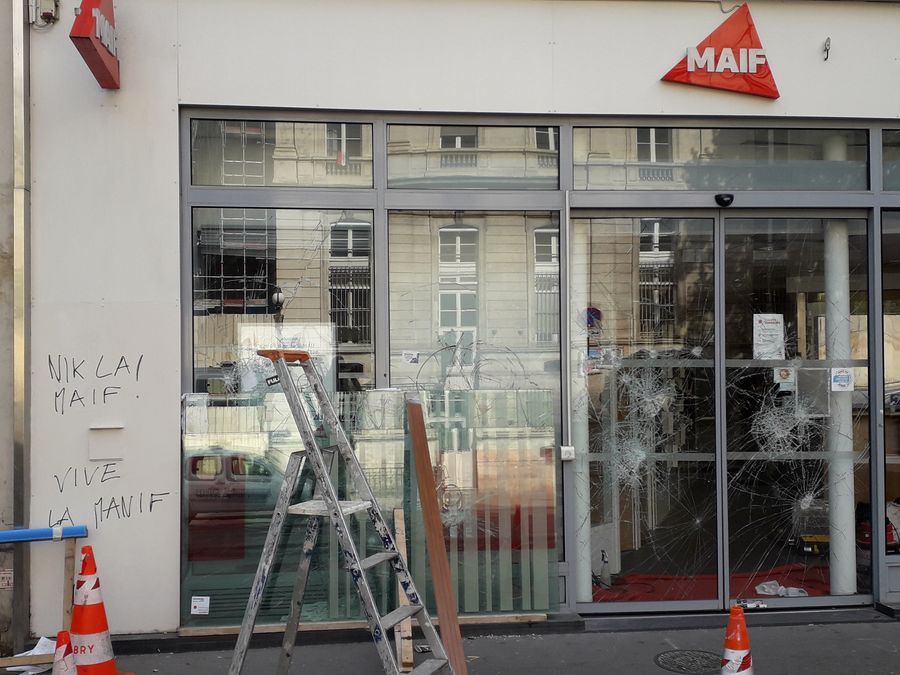 Agentur der Versicherungsgesellschaft MAIF, Place Voltaire Verpiss dich/fick dich MAIF! Es lebe die Demonstration