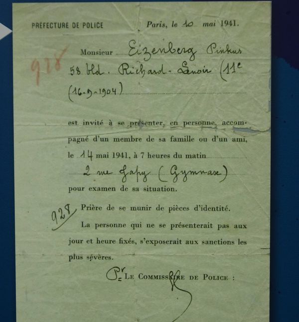 Herr Pinkus Eizenberg wird aufgefordert, persönlich in Begleitung eines Mitglieds der Familie oder eines Freundes am 14. Mai 1941 um 7 Uhr vormittags im Gymnase 2, rue Japy zur Überprüfung seiner Situation zu erscheinen. Sie werden gebeten, ein Ausweispapier mitzubringen. Wer nicht zur angegebenen Zeit erscheint, hat mit strengsten Sanktionen zu rechnen.
