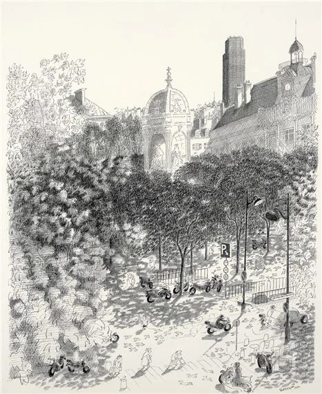 „Unter etwa 100 Bildhauern, darunter Auguste Rodin, gewann Barrias den 1879 ausgerufenen Wettbewerb, um an die Verteidigung von Paris gegenüber den Preußen 1870-71 zu erinnern. Diese bronzene Allegorie befand sich anfangs im Zentrum eines in der Perspektive des Arc de Triomphe gelegenen Kreisels, der heute der Umgestaltung des Viertels zum Opfer gefallen ist. Paris in Gestalt einer die Uniform der Nationalgarde tragenden Frau hält stolz das Banner. Mit dem kleinen Mädchen und dem Soldat zu ihren Füßen verkörpert sie den heldenhaften Widerstand der Stadt Paris. Als einziges Werk des 19. Jahrhunderts auf der Esplanade hat die Skulptur ihren Namen dem Viertel gegeben.„