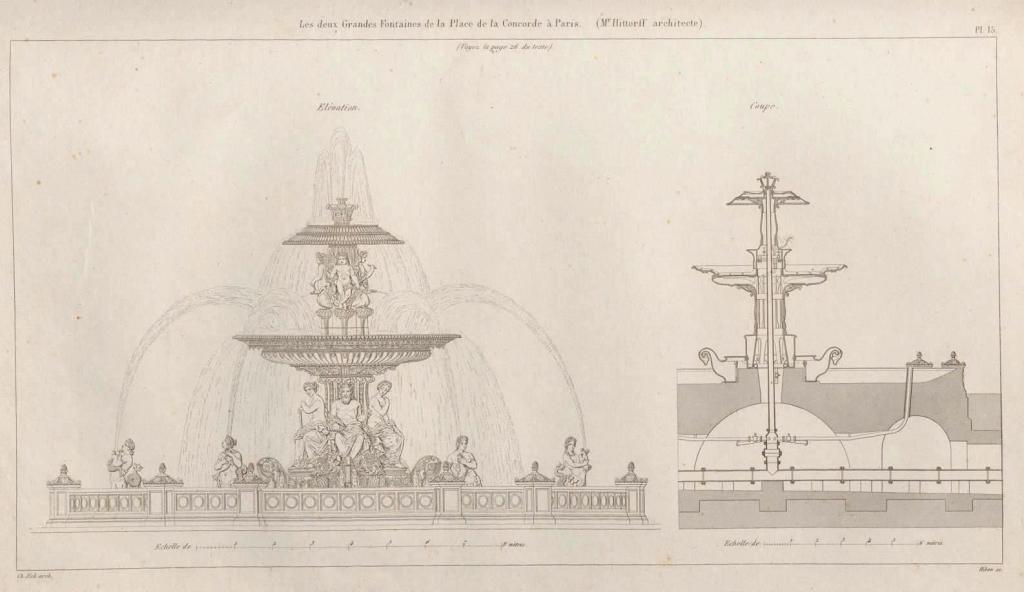 Wie die acht Städteskulpturen erfüllen auch die beiden Monumentalbrunnen eine doppelte Funktion: Mit ihrem, steinverkleideten, Figuren geschmückten Sockelbassin, aus dem sich in der Mitte ein zweiteiliger Schalenaufbau erhebt, „dem in der ersten Hälfte des 19. Jahrhunderts in Frankreich beliebten Typus italienischer Renaissancefontänen verpflichtet“ , sind sie glanzvolle Teile des „Embellissement“ des Platzes. Für den reichen Skulpturenschmuck kann Hittorff mehrere bedeutende Maler und Bildhauer gewinnen, zum Teil Schüler von Louis David oder David d’Angers, zum Teil ausgezeichnet mit dem Prestige-trächtigen Prix de Rome. [[12]]