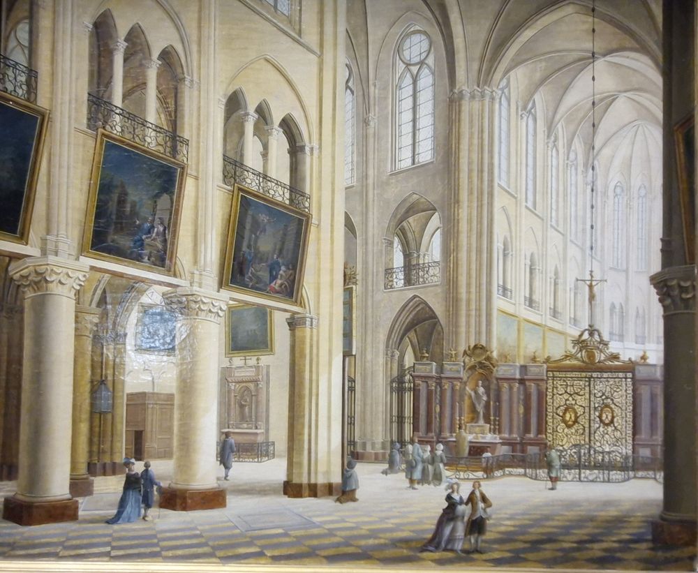 Dies ist ein um das Jahr 1780 entstandenes anonymes Gemälde: Ein Blick vom Hauptschiff der Kirche in den Chor und das nördliche Querschiff von Notre-Dame. Es vermittelt einen Eindruck vom damaligen Zustand der Kirche und ihrer Ausstattung. Auffällig ist besonders der aus teilweise vergoldetem Schmiedeeisen hergestellte Lettner, der den für die Domherren reservierten Chor der Kirche von ihren anderen, den Gläubigen und Besuchern zugänglichen Teilen trennt. An dem großen Pfeiler in der Mitte erkennt man einen Marienaltar mit einer Statue, der man wundersame Kräfte zuschrieb. Seit 1855 steht dort auf Veranlassung Viollet-le-Ducs die berühmte mittelalterliche Statue der Maria mit Jesuskind, die den Brand von 2019 unbeschadet überstanden hat. Zwischen den Pfeilern des Langhauses und des nördlichen Querschiffs hängen monumentale Gemälde. Mit ihnen wurde die Kirche nach den Religionskriegen ausgestattet, um ihr im Zuge der Gegenreformation mehr Glanz zu verleihen und um den Gläubigen die biblische Geschichte und das Leben, Leiden und den himmlischen Lohn von Heiligen anschaulich zu machen.