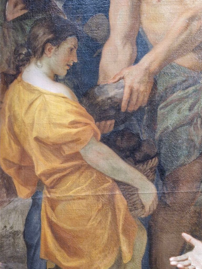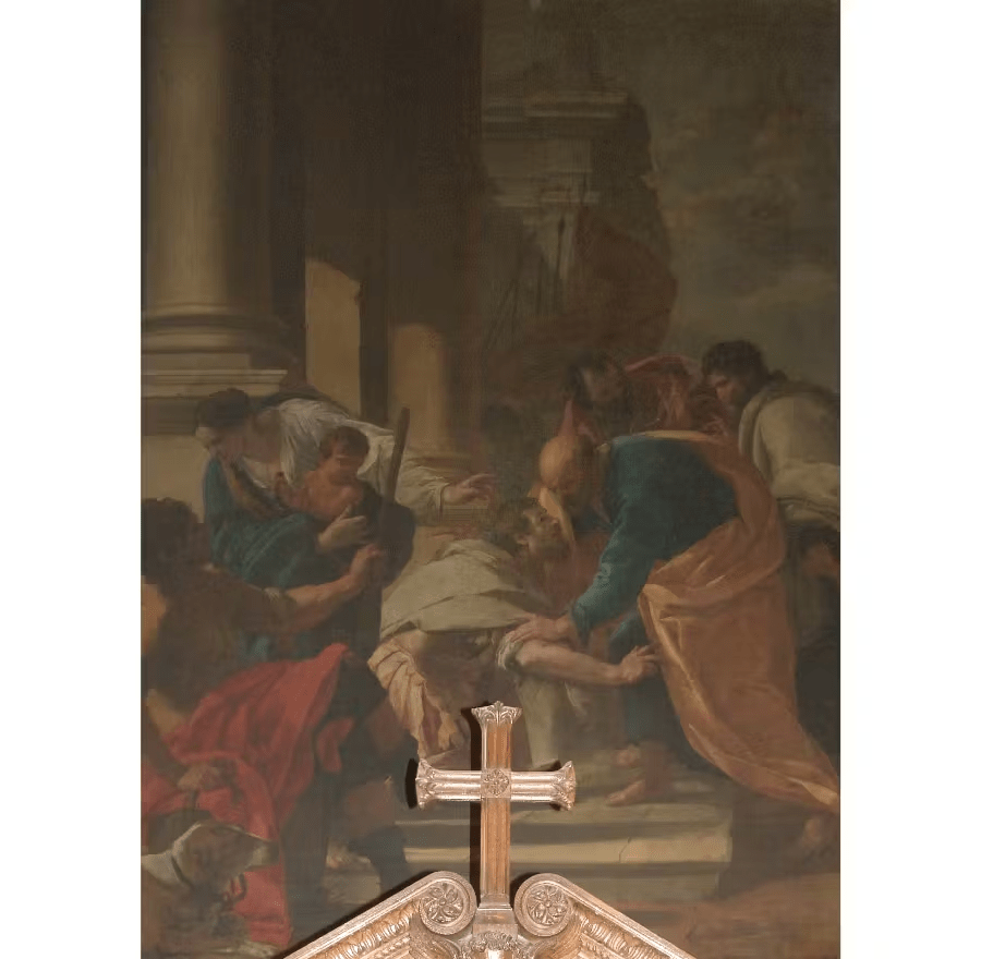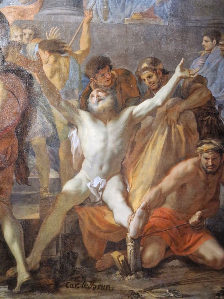Die Gilde der Goldschmiede wurde geleitet von vier jeweils für zwei Jahre gewählten Meistern. Die beiden zuletzt Gewählten waren für das nächste May-Gemälde zuständig: Thematik, Auswahl und Beauftragung des Künstlers, Übernahme der Kosten…Das war natürlich eine prestigeträchtige Angelegenheit, und manche Auftraggeber nutzten durch die Beauftragung prominenter Maler die Gelegenheit, ihren Rang und Reichtum zur Schau zu stellen. Insgesamt entstanden so 76 großformatige Bilder, die die Kathedrale schmückten: Man hat sie deshalb auch „das erste Museum französischer Malerei“ genannt.[2] Bewundert im 18. Jahrhundert, wurden die Mays während der Französischen Revolution aus der Kirche entfernt: In einem Tempel der Vernunft waren sie fehl am Platz… Immerhin fielen sie nicht dem revolutionären Vandalismus zum Opfer wie die Königsköpfe der Fassade, sondern wurden überwiegend in Museen eingelagert, zum Teil auch verkauft. Die beiden im oben abgebildeten Gemälde identifizierten May-Gemälde beispielsweise befinden sich heute in einem englischen Schloss und -wie mehrere andere Mays- im Depot des Museums von Arras. Einige kehrten wieder in die Kirche zurück, nachdem Napoleon 1801 ein Konkordat mit dem Heiligen Stuhl abgeschlossen hatte. Auch Gemälde, die die napoleonischen Truppen bei ihrem Italienfeldzug erbeutet hatten, schmückten nun die Kirche. Aber dann kam Viollet-le-Duc, dessen Rekonstruktion von Notre-Dame sich am Idealbild einer gotischen Kathedrale orientierte, und dazu passten die barocken Gemälde nicht. Also wurden sie 1862 erneut aus der Kirche entfernt und dem Louvre übergeben. Im 20. Jahrhundert aber begann man sich wieder für die Mays zu interessieren, 52 davon konnte man noch identifizieren und 13 fanden wieder ihren Platz in Notre-Dame – allerdings nicht mehr zwischen den Pfeilern des Hauptschiffs, sondern etwas versteckt und verdunkelt in Seitenkapellen. Dort überlebten sie den Brand von 2019. Die Jahre der Rekonstruktion der Kathedrale wurden genutzt, um sie, zusammen mit anderen Gemälden der Kirche, zu restaurieren. Bevor sie Ende 2024 wieder an ihre angestammten Plätze zurückkehren, sind sie nun als ein einzigartiges Ensemble der französischen Malerei des 17. Jahrhunderts in den Ausstellungsräumen der Galerie des Gobelins aus der Nähe zu betrachten.