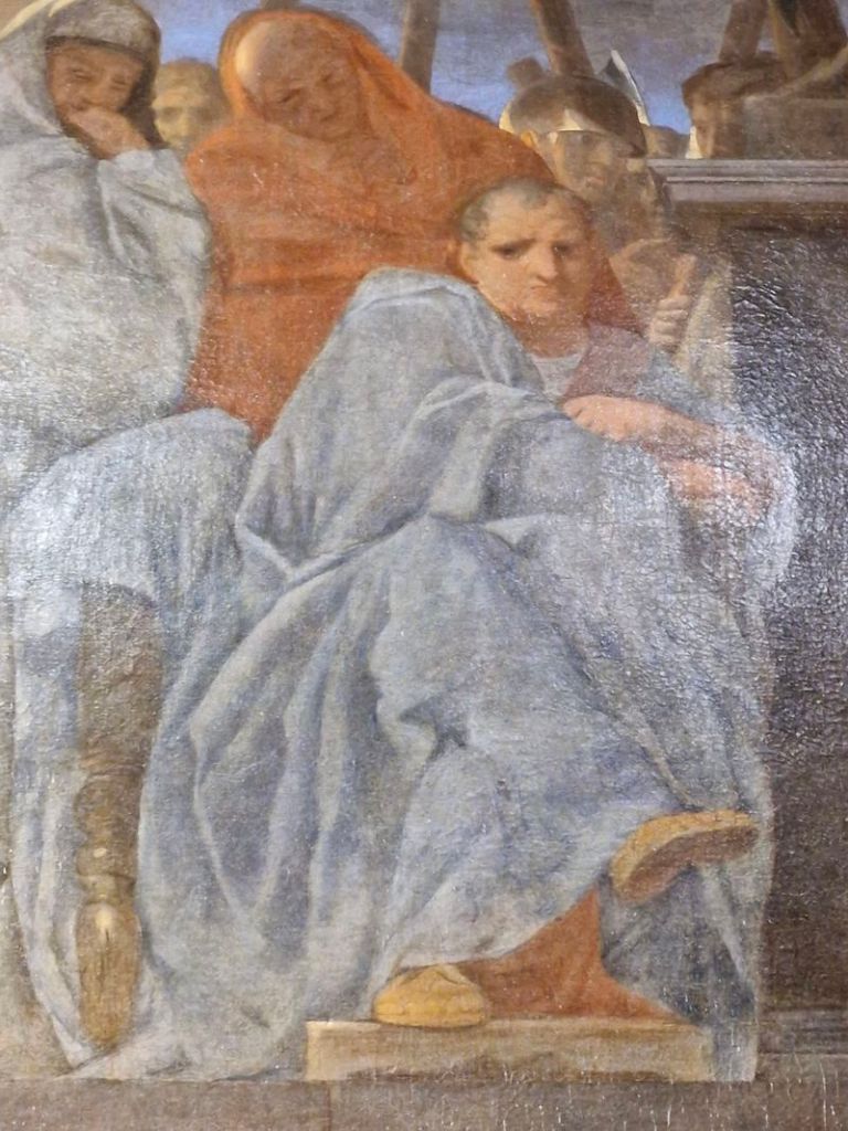 Und von oben sieht der römische Statthalter Aegeas dem Geschehen zu. Er hatte Andreas zum Tode verurteilt, weil der seine Frau zum Christentum bekehrt hatte. (Bei der Rückkehr von der Hinrichtung soll Aegeas allerdings zur Strafe dem Wahnsinn verfallen sein…)