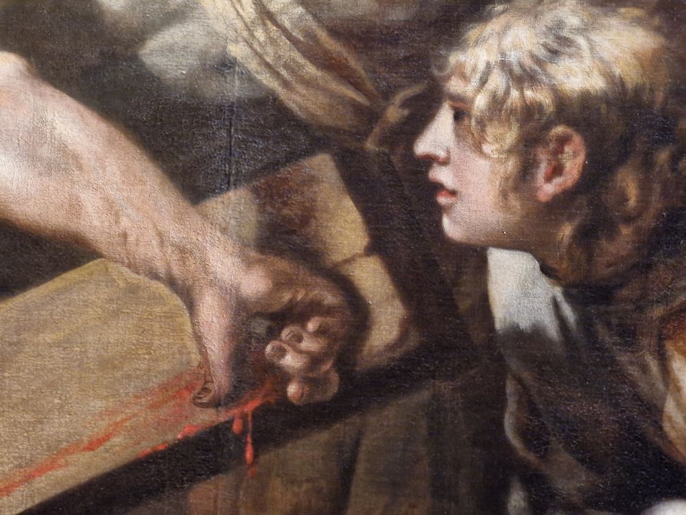 Auf dem May-Gemälde von 1643 geht es, wie das Detail des gefährlich seine Zähne fletschenden und nicht angeketteten Hundes zeigt, um Gewalt….